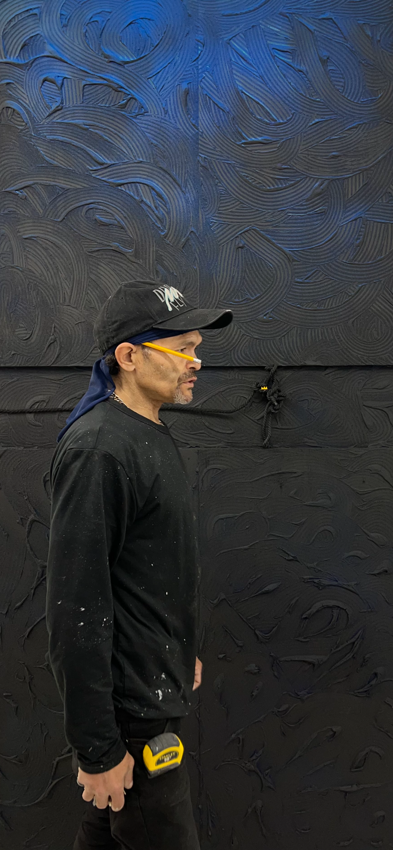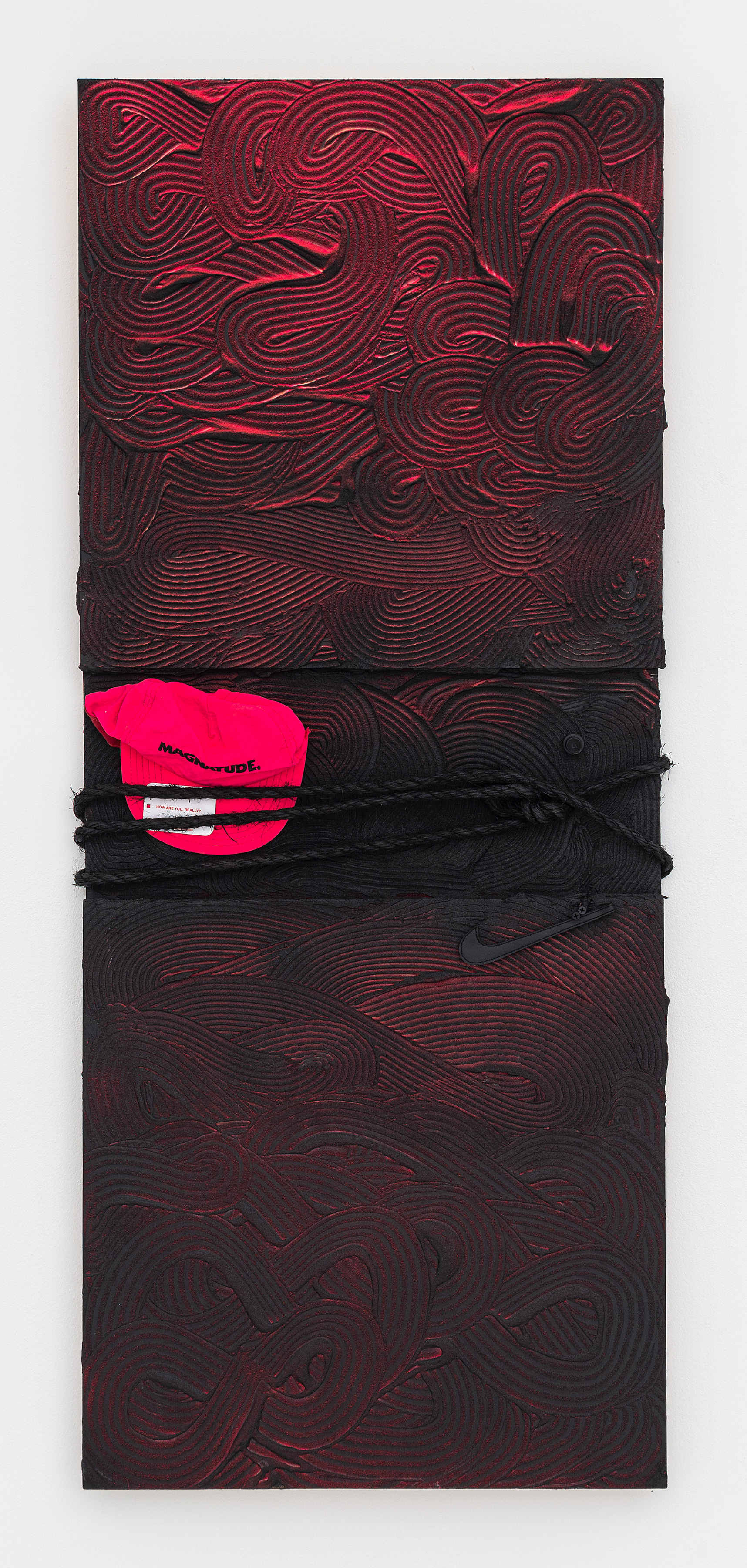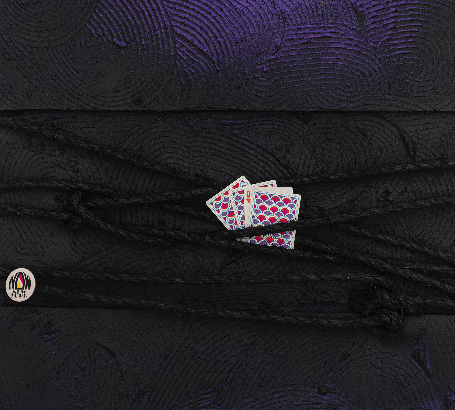 I navigate texture, luminosity, color and assemblage. My intention is to explore the natural and unnatural by combining materials like acrylics with pumice stone, jute and nylon, cotton and ink. As the experiments expand; I ask, what are we learning and unlearning? In the context of my work, rope is symbolic of a utility rather than a weapon. It is being used as a support to hold conversations up, rather than as a reminder of what can hold us back.